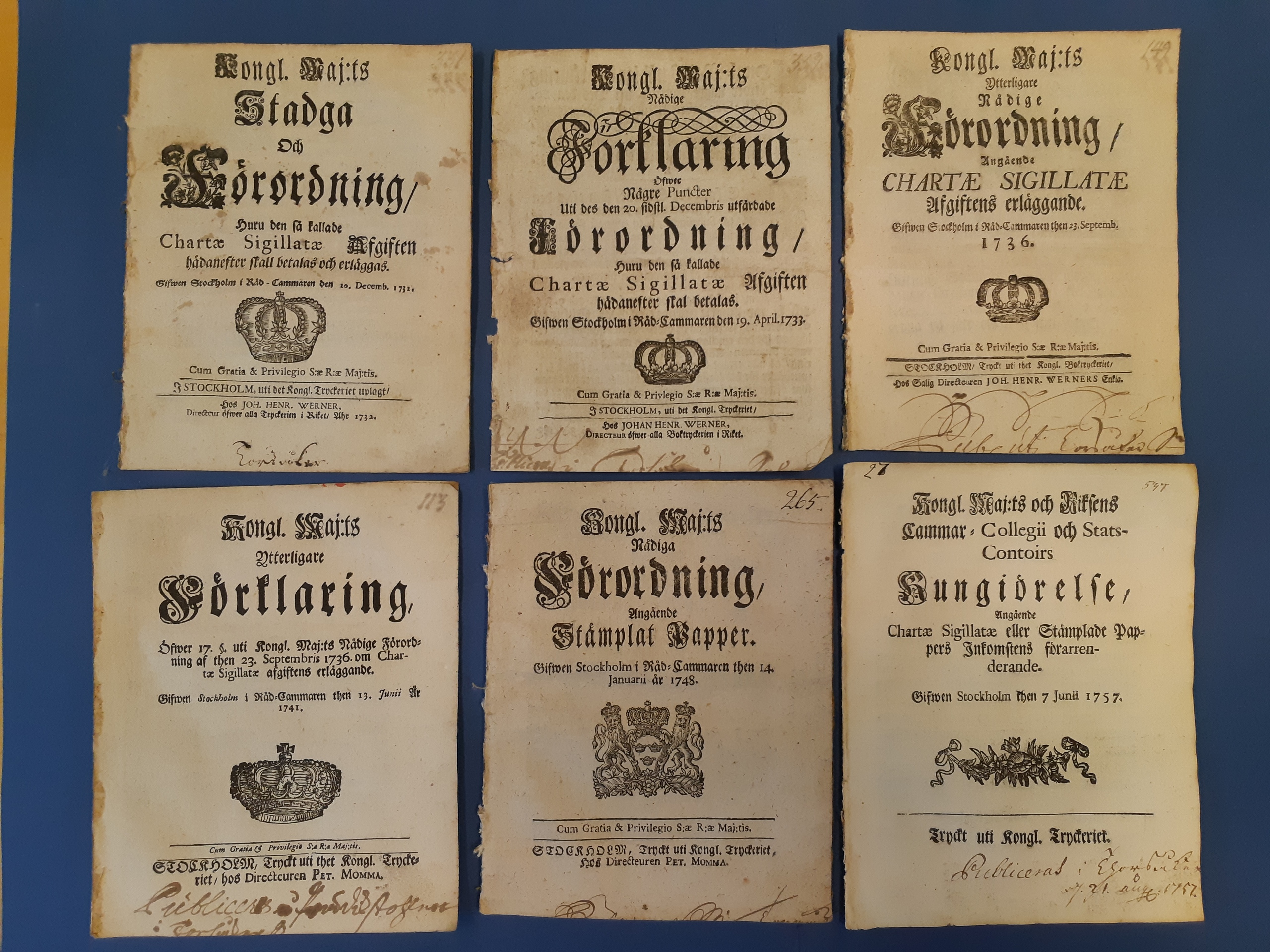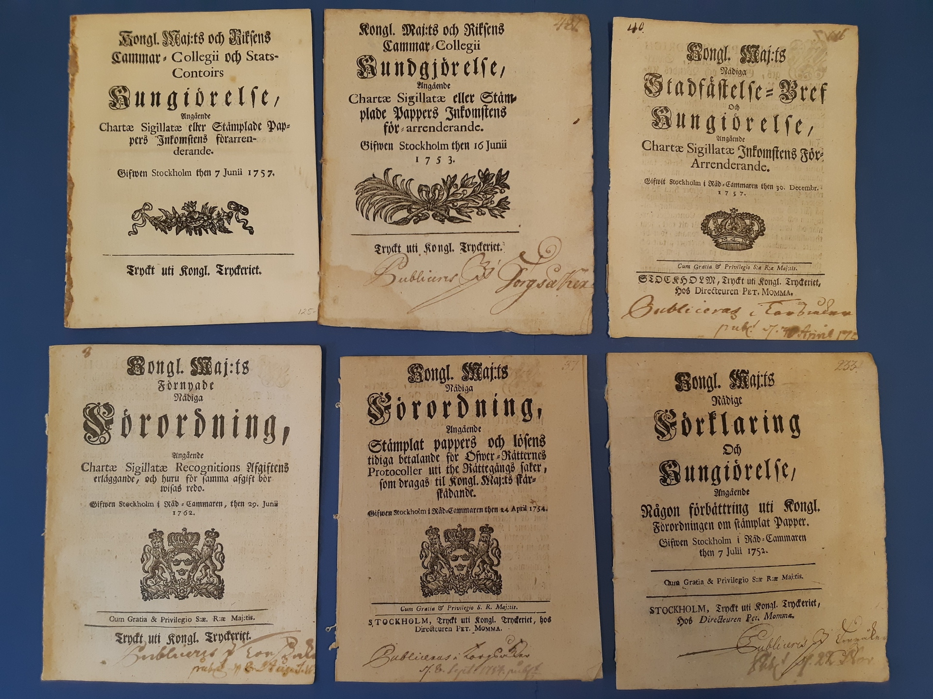 Literature. 12 announcements about Charta Sigillatae, 1732–1753, most with notes about being read and a few with crown mail coils. The entire lot is presented at www.philea.se.