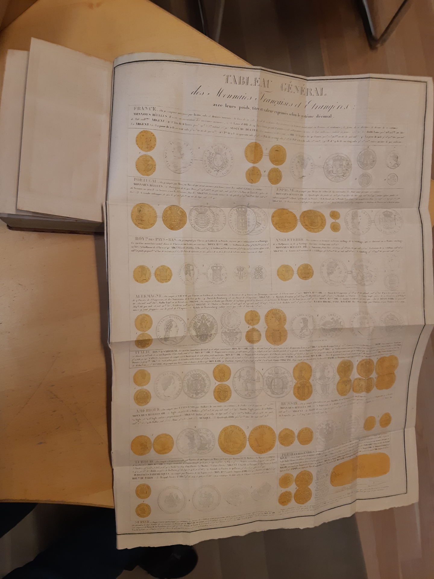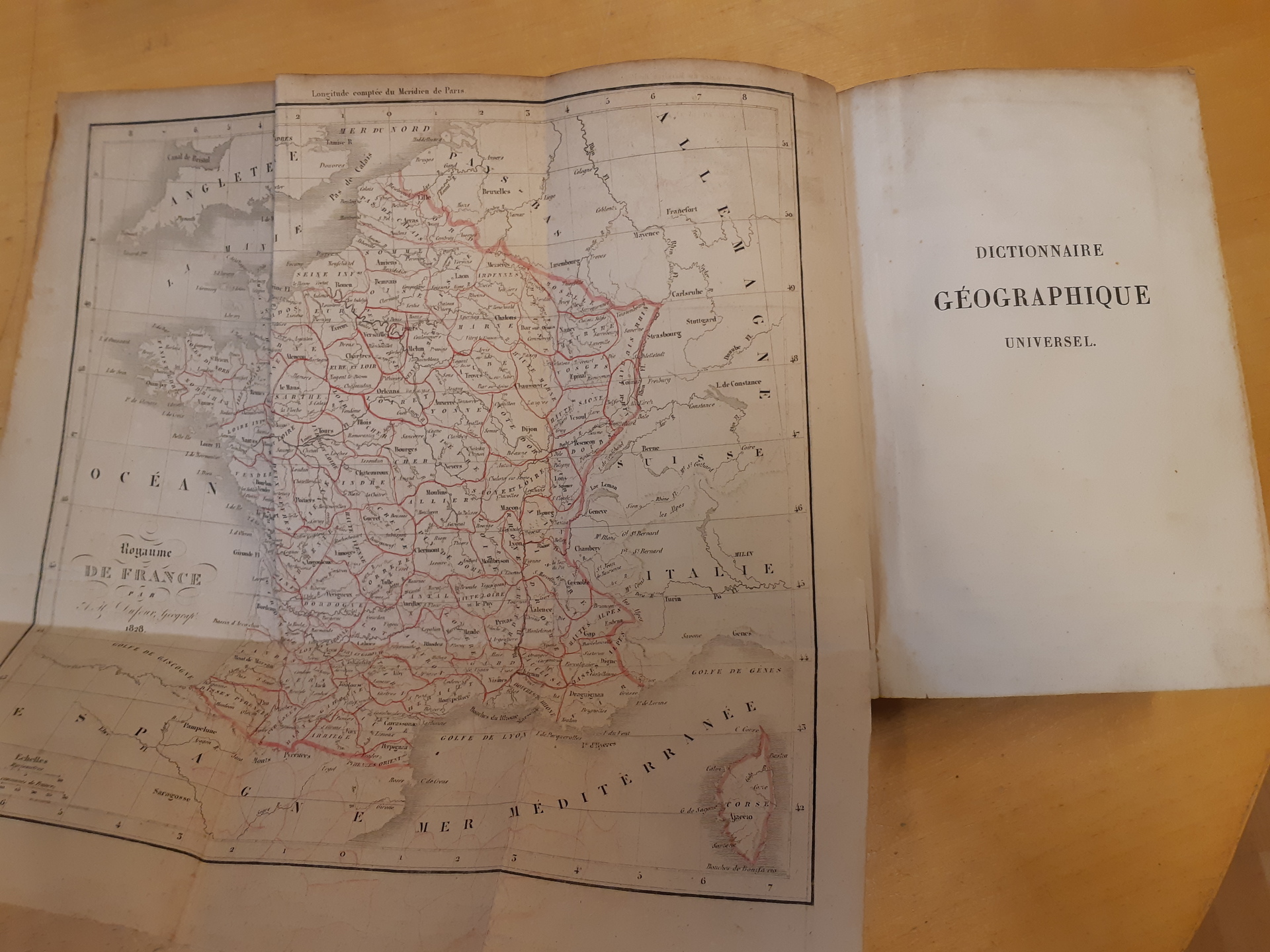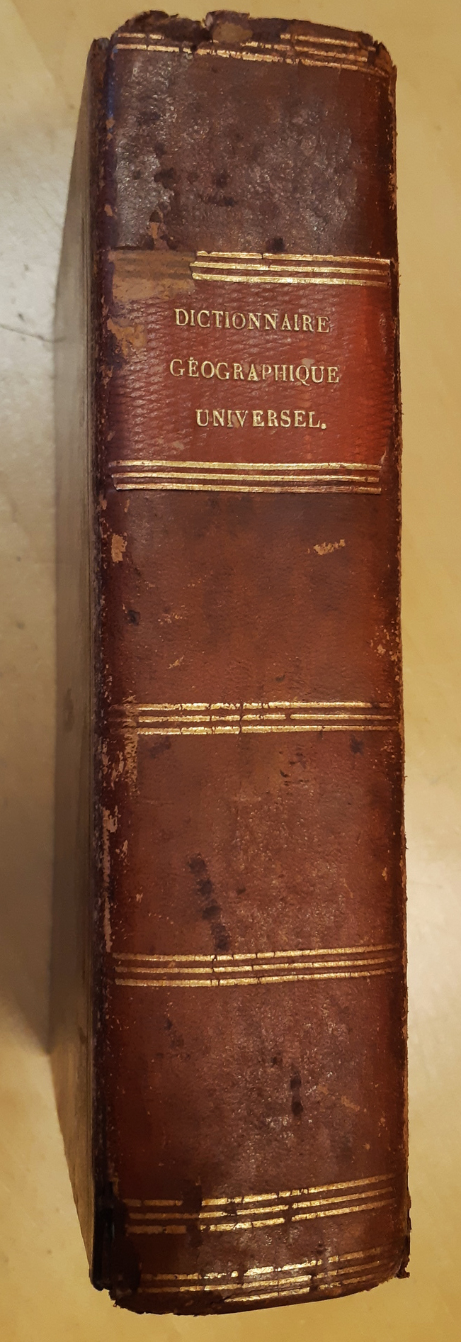 Literature. 'Dictionnaire geographique universel', H. Tarlier Et Aug. Wahlen, Bruxelles, 1830, hardcover, 740 pp. plus fold-out maps general of the earth, Europe, Asia, Africa, North America, and one large with coins from different countries in colour. Used, spine worn and leaves with some age spots, maps fine.