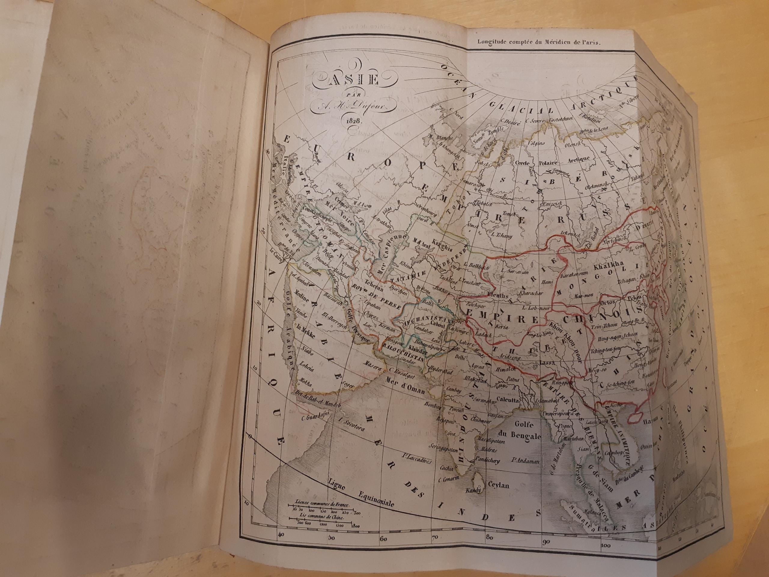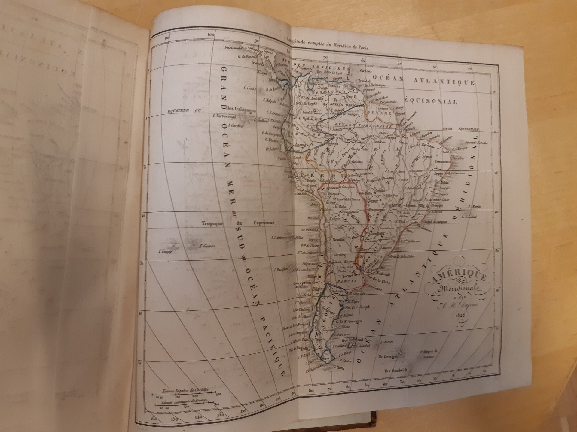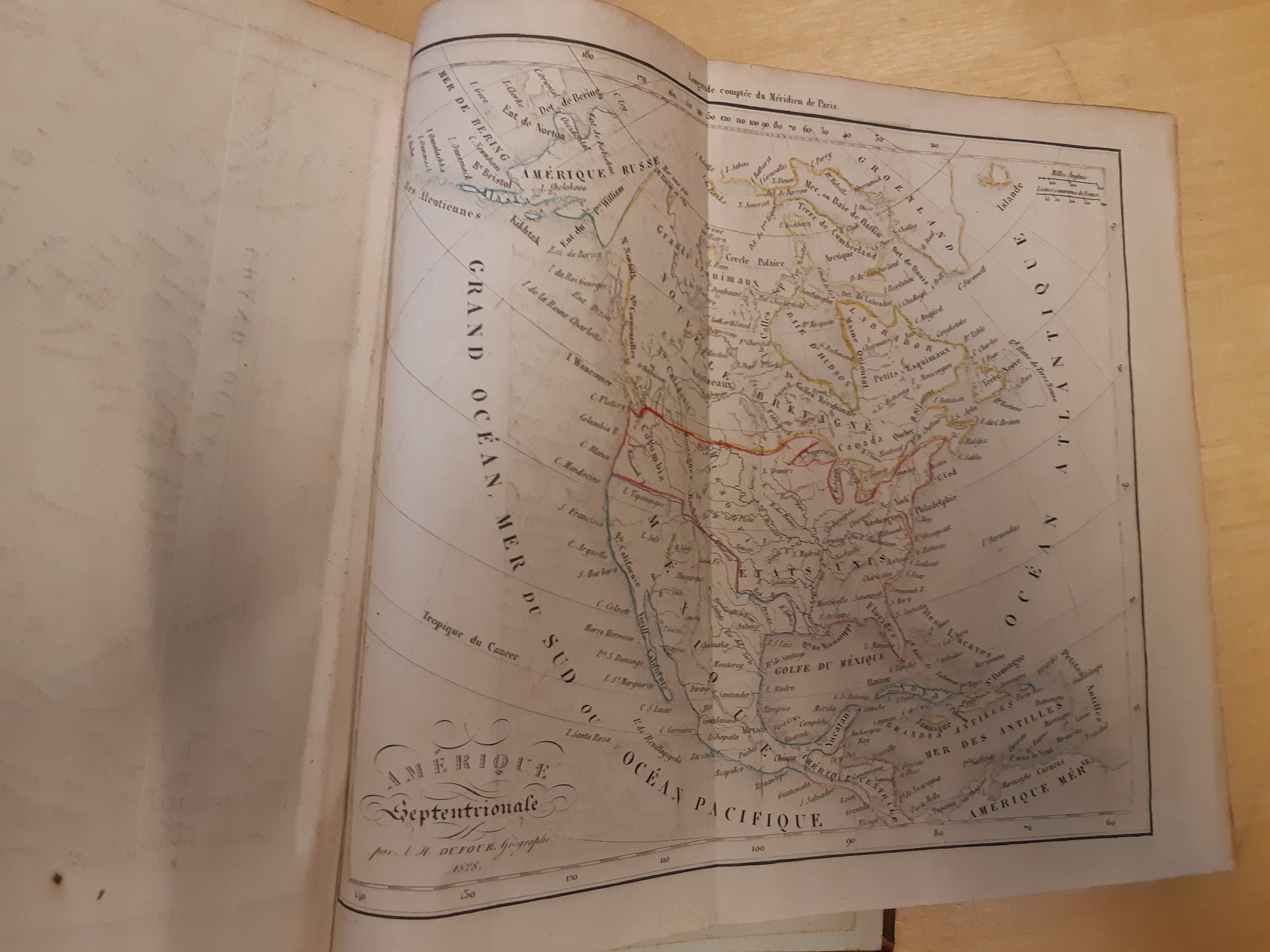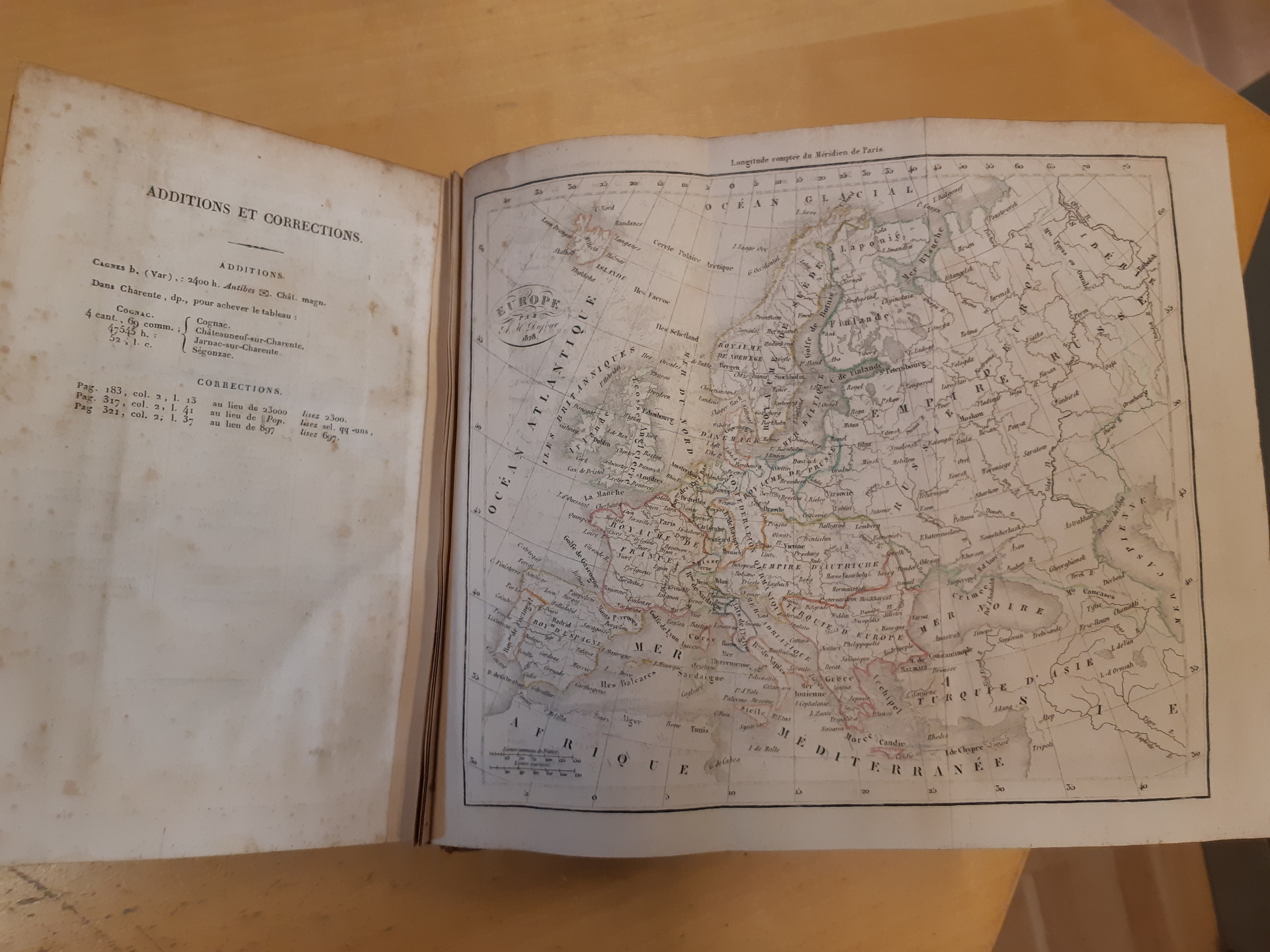 Literature. 'Dictionnaire geographique universel', H. Tarlier Et Aug. Wahlen, Bruxelles, 1830, hardcover, 740 pp. plus fold-out maps general of the earth, Europe, Asia, Africa, North America, and one large with coins from different countries in colour. Used, spine worn and leaves with some age spots, maps fine.