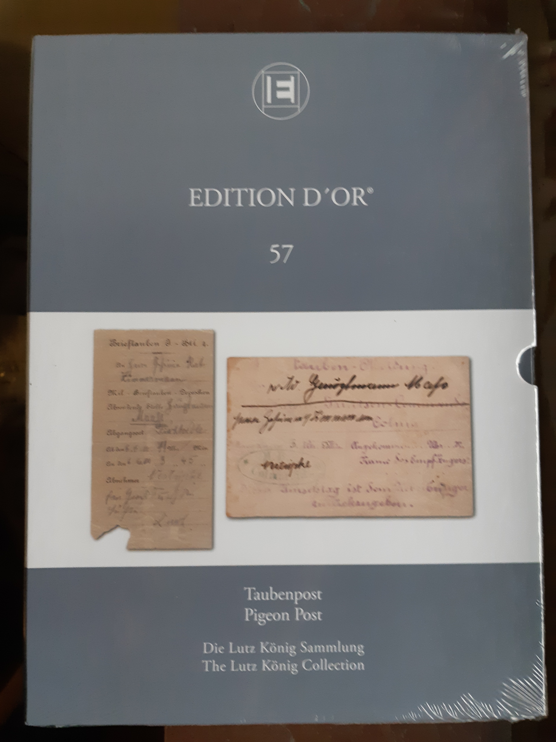 Literature, MOTIV, Birds. EDITION D'OR, Vol. 57 'Pigeon Post – The Lutz König Collection', The Global Philatelic Network, 2019. The Large Gold awarded exhibit depicted in its entirety, hardcover, with slipcase and dust jacket, 128 pp., English. New, still wrapped in plastic.