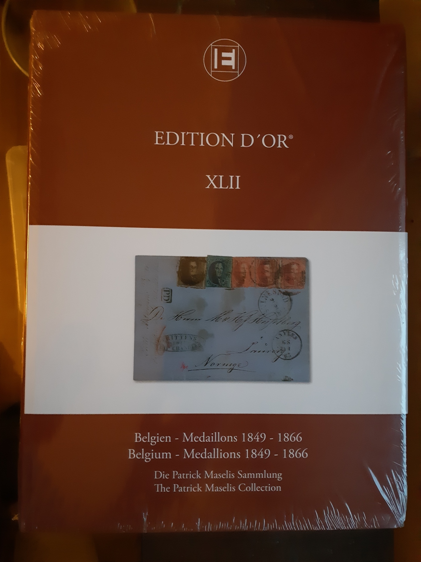 Literature. EDITION D'OR, Vol. XLII 'Belgium – Medaillons 1849–1866 – The Patrick Maselis Collection', The Global Philatelic Network, 2013. The Large Gold awarded exhibit depicted in its entirety, hardcover, with dust jacket, 324 pp., introduction bilingual English/German. New, still wrapped in plastic.