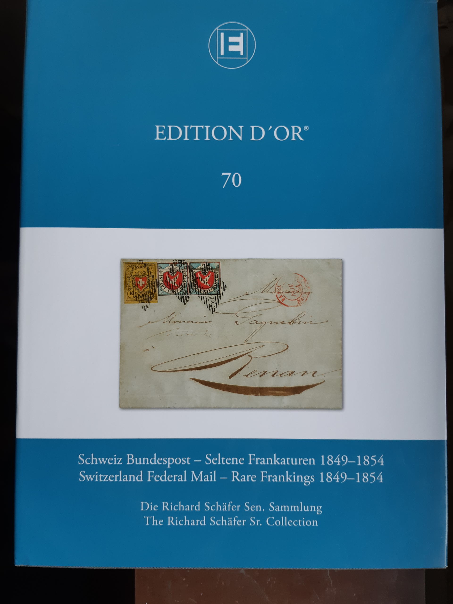 Literature. EDITION D'OR, Vol. 70: 'Switzerland Federal Mail – Rare Frankings 1849–1854 – The Richard Schäfer Sr. Collection', The Global Philatelic Network, 2023. The Large Gold awarded exhibit depicted in its entirety, hardcover, with dust jacket, 160 pp., introduction bilingual English/German. As new.