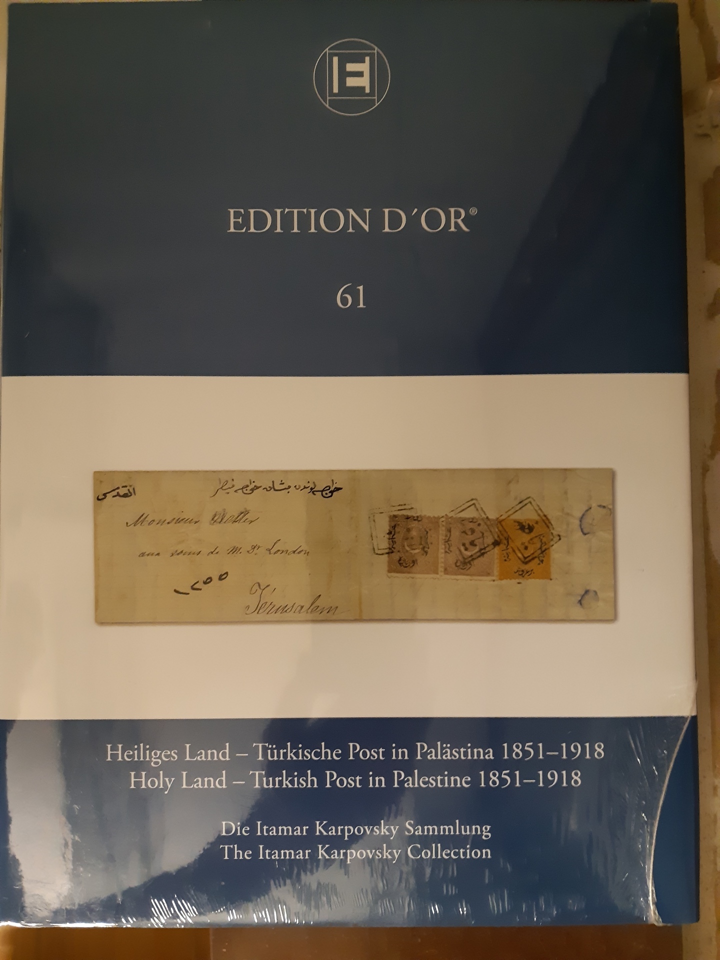 Literature, Levant. EDITION D'OR, Vol. 61 'Holy Land – Turkish Post in Palestine 1851–1918 – The Itamar Karpovsky Collection', The Global Philatelic Network, 2022. The Large Gold awarded exhibit depicted in its entirety, hardcover, with dust jacket, 164 pp., introduction bilingual English/German. New, still wrapped in plastic.