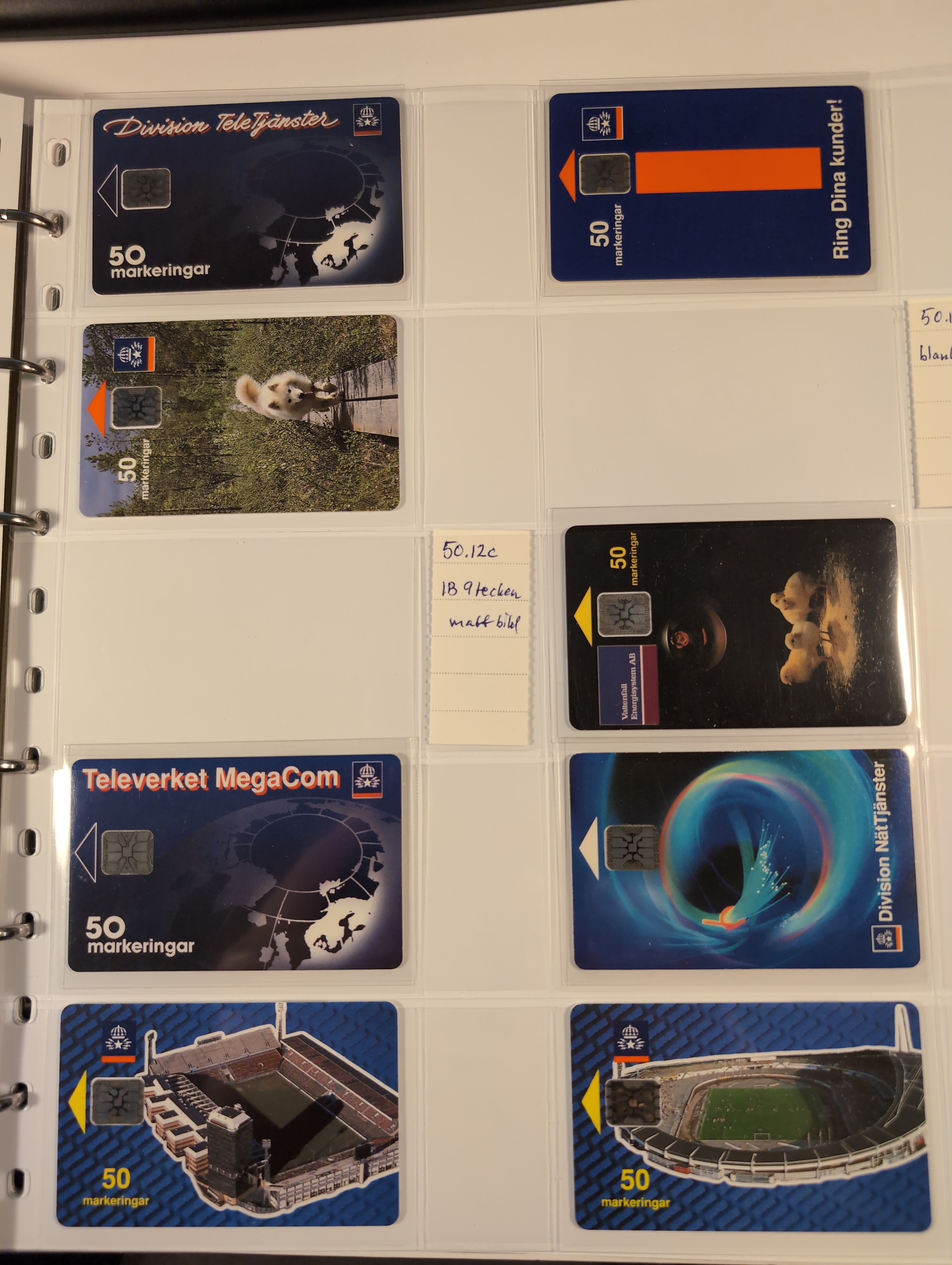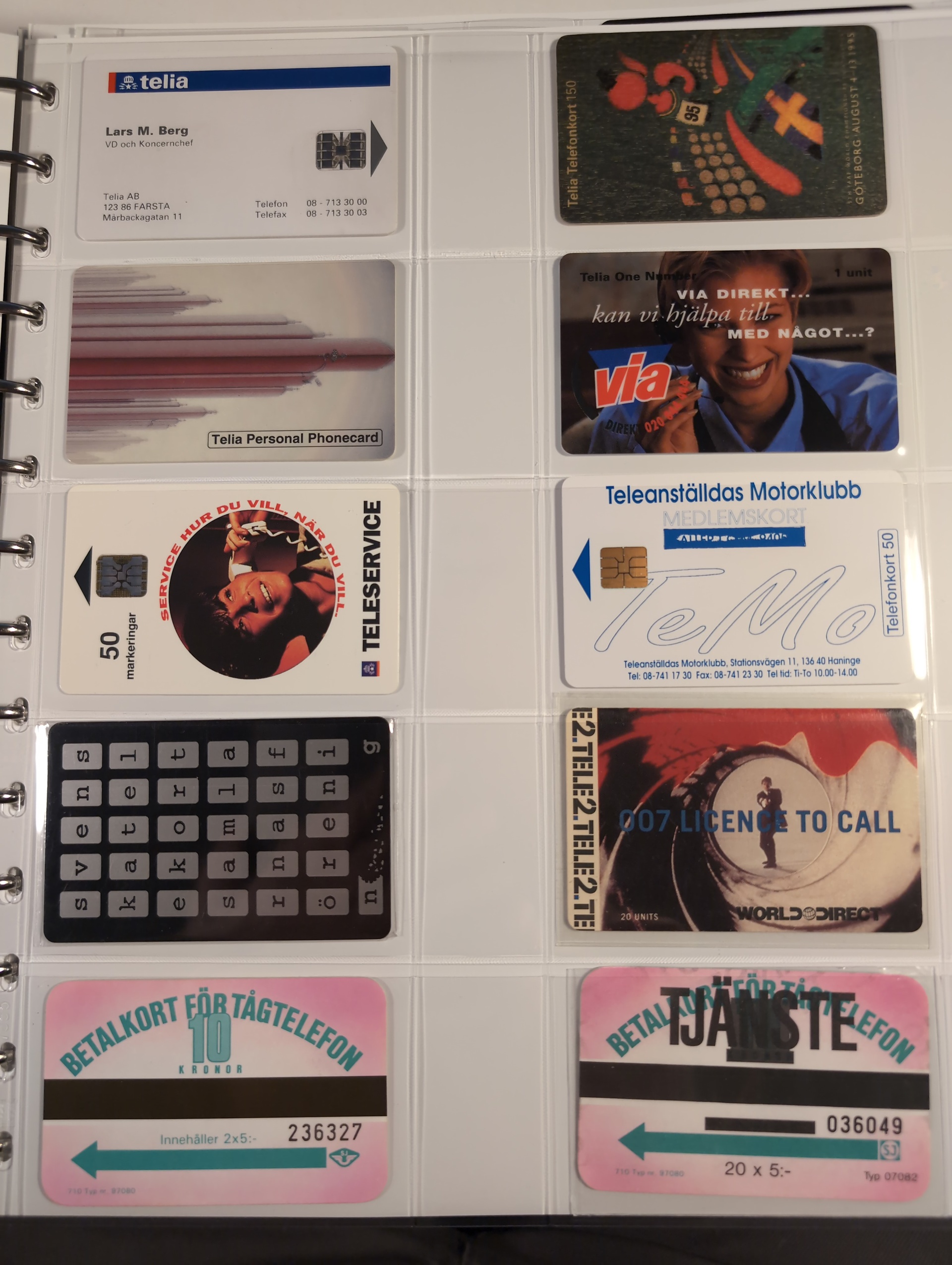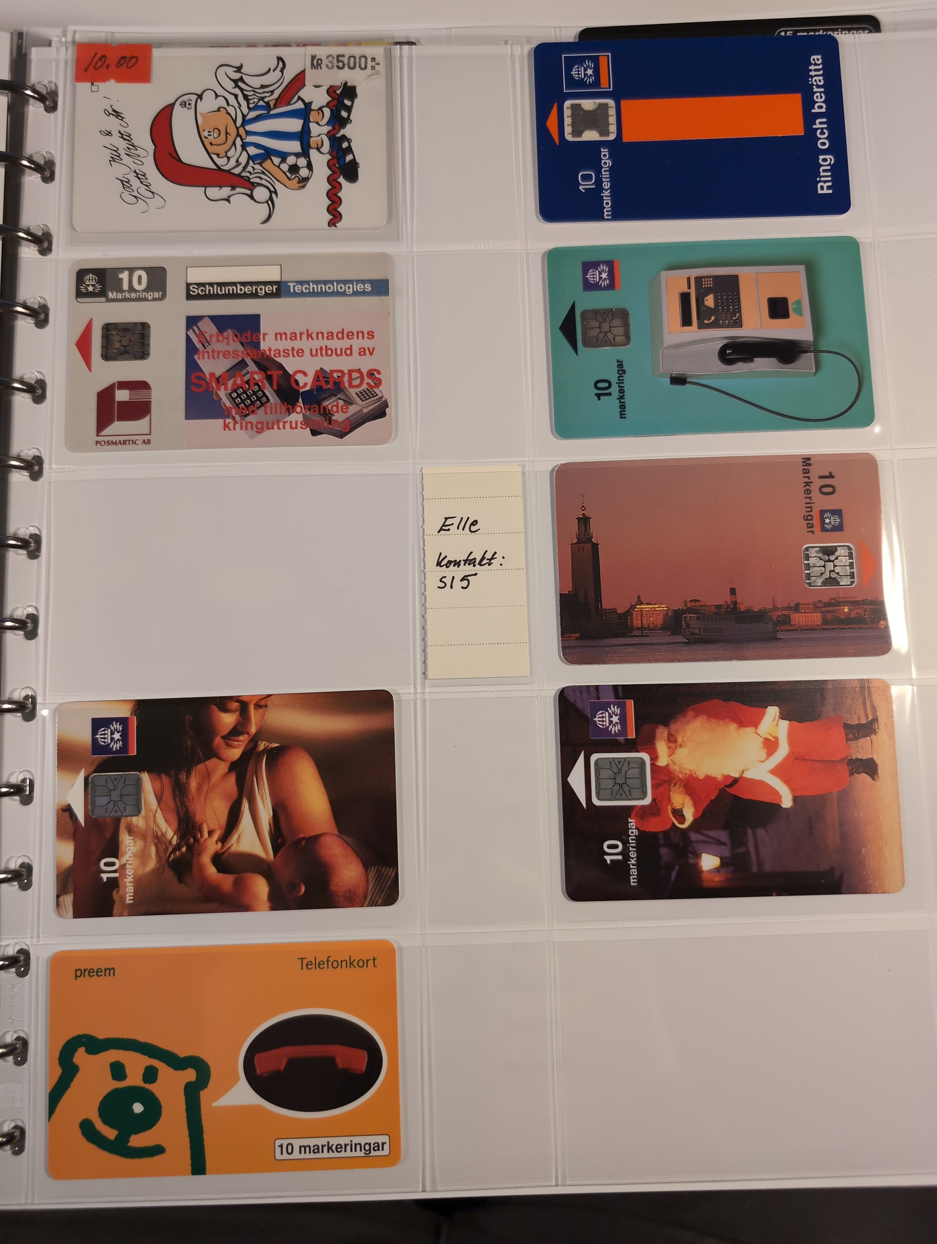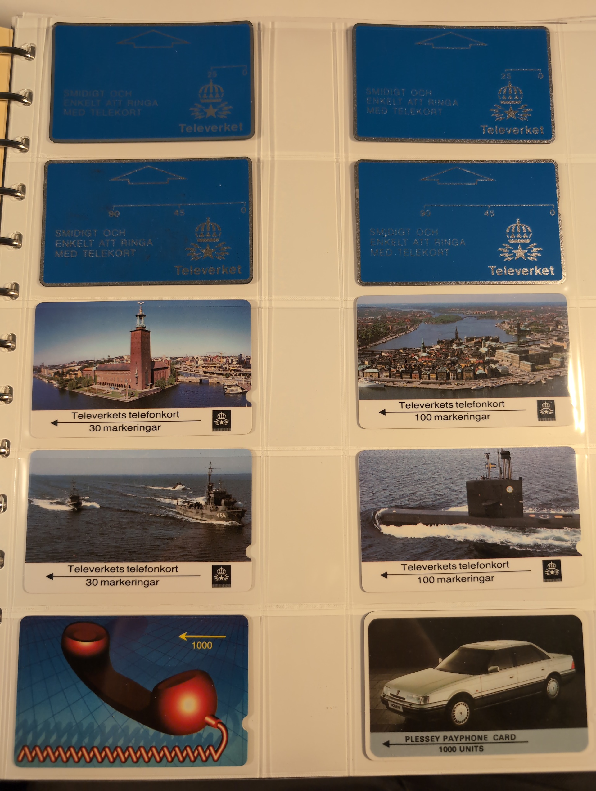 Telephone cards, ALL WORLD. Well filled collection, Sweden in seven albums and three foreign. mostly mint with many premium and promotion cards e.g. Spaceman, Gothenburg Santa, early magnetic cards (some used) e.g. Uppsala and Regiment cards. There is also a card reader included. Among the foreign cards we can mention one leadger with British Mercury Cards. In addition there are two boxes with duplicates (about 200 cards). In total over 1000 cards. Approx. 31 kg.