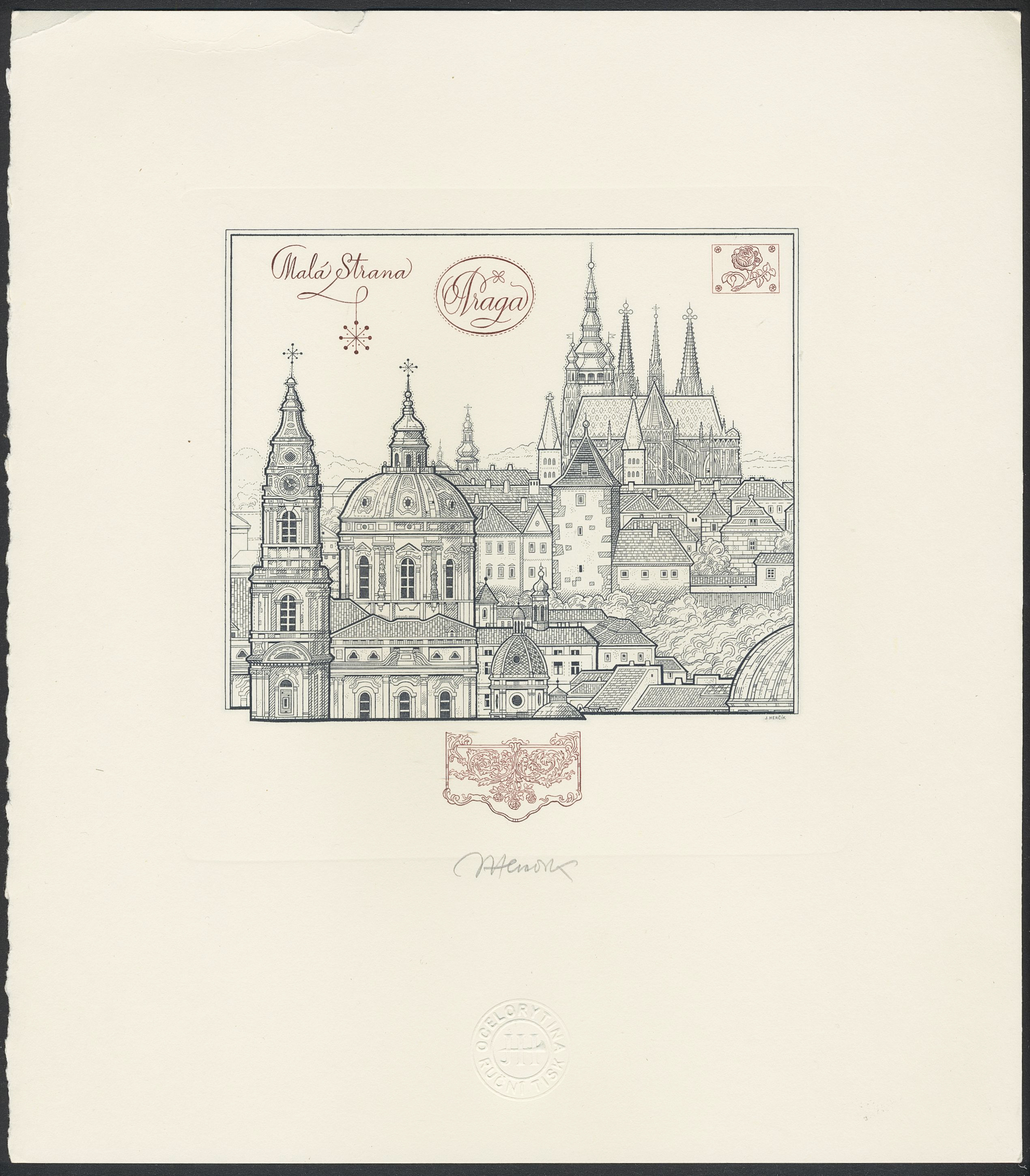 Art. Print in copper by the famous Czech engraver Jozef Hercik, depicting Mala Strana in Prague, an important place for the Swedish army during the 30 Year's War, now the place for the Swedish Embassy. Signed by Jozef Hercik! Small fold and tear at the top.