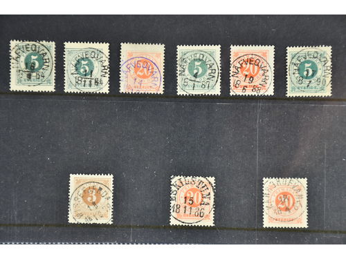 Sweden. Lot used. Nine stamps: six copies cancelled NÄFVEQVARN incl. one with purple canc., plus WISSEFJERDA, ESKILSTUNA and KÄRRGRUFVAN. Show less