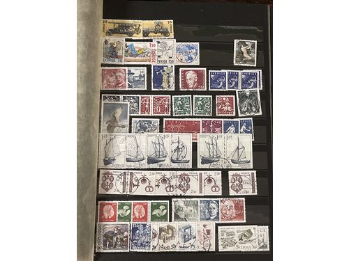 Sweden. Collection/accumulation mostly used 1858–2000 in box. One album with mainly used stamps up to 1977. One stockboo..