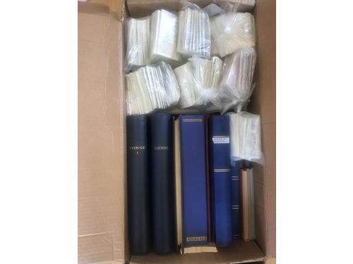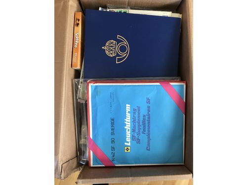 Sweden. Collection/accumulation mostly used 1900s in box. One album that contains unused stamps and also some from abroa..
