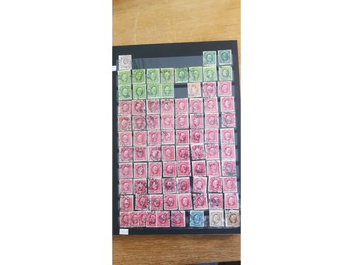 Sweden. Accumulation used 1885–1911 in box. Oscar II letterpress and copperplate recess. Stamps in boxes, on visir leaves, in envelopes etc. Not explored. Options forr varieties, good cacellations, shades etc Please explore! Somewhat mixed quality. (>1000) Show less