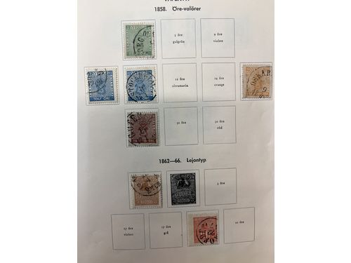 Sweden. Collection ★/⊙ 1858–1945 in stockbook. In the beginning used incl. 1858 cpl., 17öre lion, and various Circle typ..
