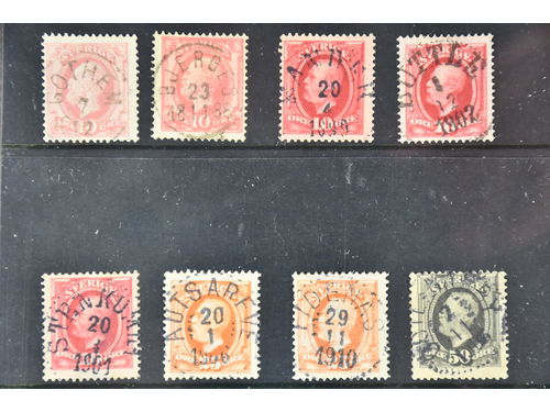 Sweden. Cancellations. GOTLAND. Eight O II stamps, cancelled GOTHEM, BJERGES, BANDER, BUTTLE, STENKUMLA, AUTSARFVE, FIDE.. Read more Sweden. Cancellations. GOTLAND. Eight O II stamps, cancelled GOTHEM, BJERGES, BANDER, BUTTLE, STENKUMLA, AUTSARFVE, FIDENÄS and GOTL. KARBY. Mostly superb cancellations. Show less