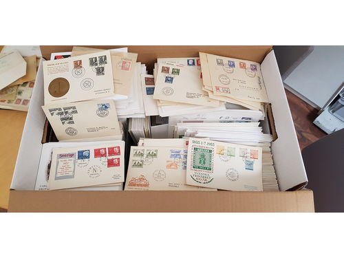Sweden. FDCs, collection/accumulation 1945–2001 in banana box. A box full of Swedish FDC and also including two FDC albums also full of FDC. Please see a selection of scans at www.philea.se. Mostly fine quality. Approx. 12 kg. (>1000) Show less