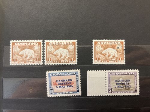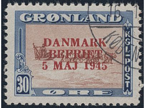 Greenland. Facit 24v2 or Scott 22a used, 1945 Overprint "Danmark Befriet 5 Maj 1945" 30 øre brown-red/blue, red overprint. SEK 1800 Show less