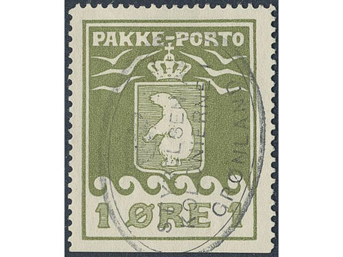 Greenland. Parcel Facit P4 IB used, 1915 Thiele II 1 øre light olive-green print 1 on white paper, perf on 3 sides. SEK 1500 Show less