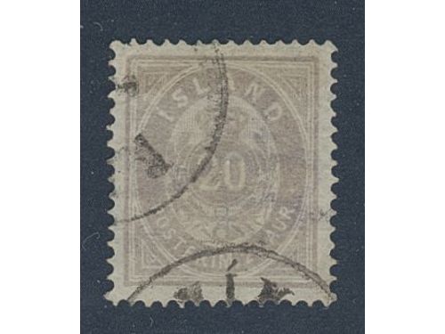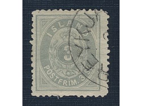 Iceland. Facit 23 used, 1876 Aur values 5 aur blue-grey, rough perf 12¾. Short corner and with heavy cancel. SEK 6500