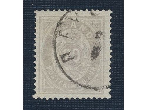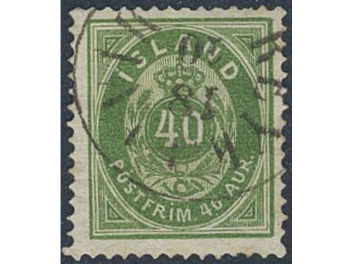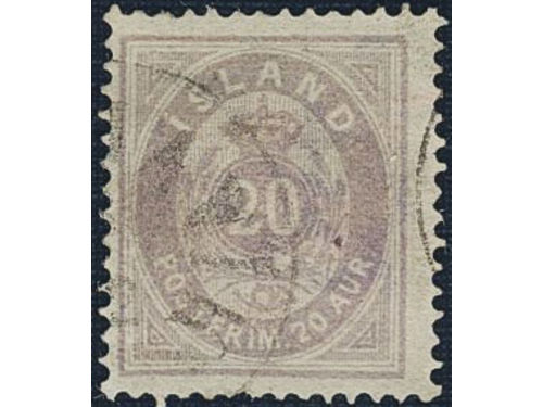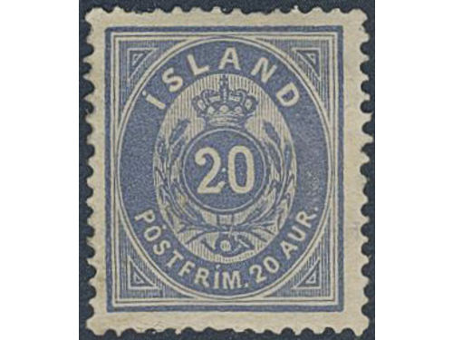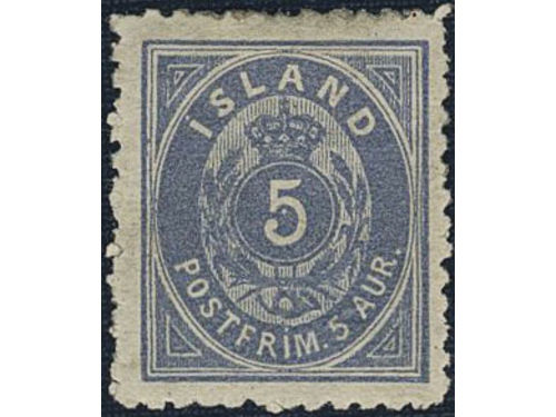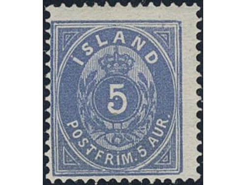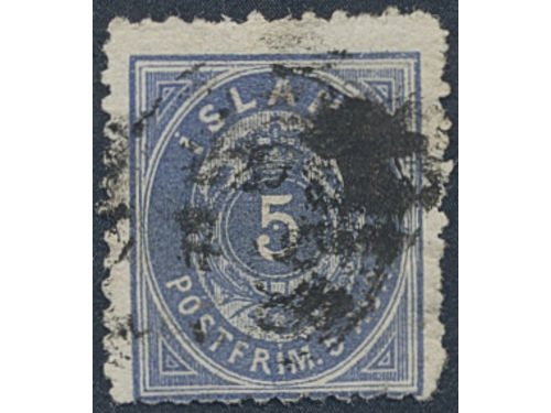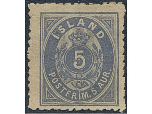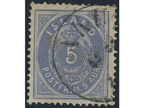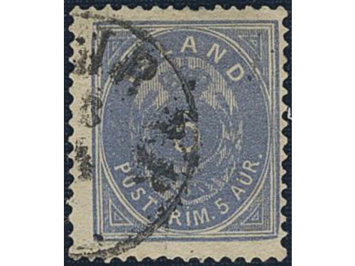 Iceland. Facit 23 used, 1876 Aur values 5 aur blue-grey, rough perf 12¾. Short corner and with heavy cancel. SEK 6500 Show less