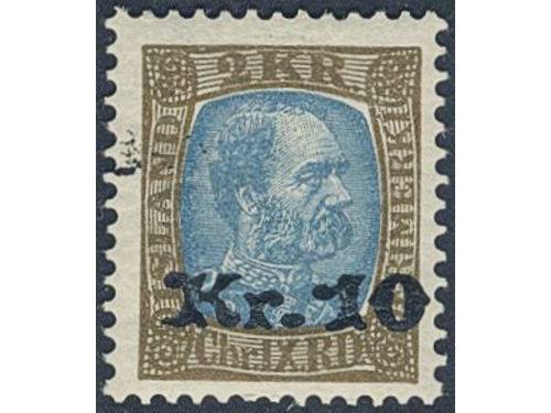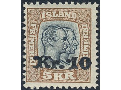 Iceland. Facit 103 ★★, 1929 Surcharge on Christian IX 10 Kr / 2 Kr blue/olive-brown. With an interesting black spot in left margin, probably smudged printing ink from the surcharge. SEK 2300 Show less