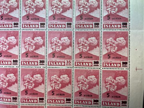 Iceland. Facit 326v2 ★★, 1954 Surcharge on Hekla 5/35 aur carmine bars missing (pos. 28). In full sheet. Edition ca. 500. SEK 1800 Show less