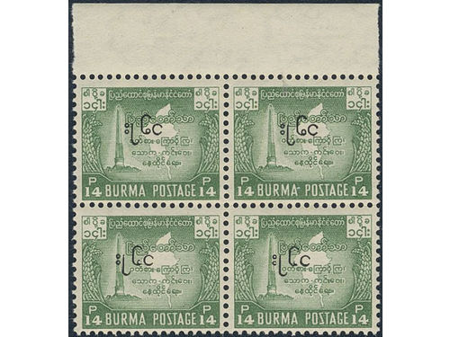 Burma. SG 164a ★★, 1961 15p on 14p green with INVERTED OVERPRINT variety. GBP 104 Burma. SG 164a ★★, 1961 15p on 14p green with INVERTED OVERPRINT variety. GBP 104 Show less