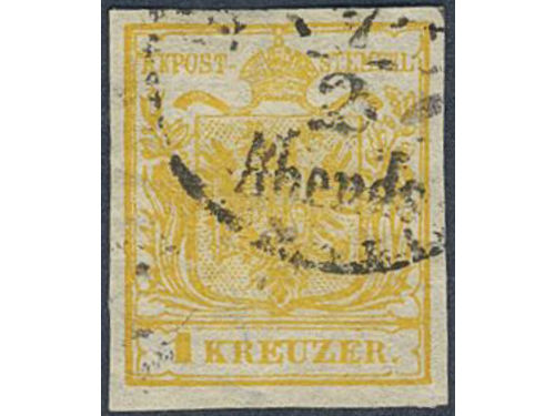 Austria. Michel 1x used, 1850 Coat-of-arms 1 Kr yellow wmk 1. EUR 150 Austria. Michel 1x used, 1850 Coat-of-arms 1 Kr yellow wmk 1. EUR 150 Show less