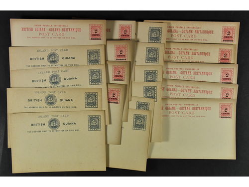British Guyana. Postal stationery. 1886–92 1 c green and 2c on 6c red, ten unused postal cards of each. British Guyana. Postal stationery. 1886–92 1 c green and 2c on 6c red, ten unused postal cards of each. Show less