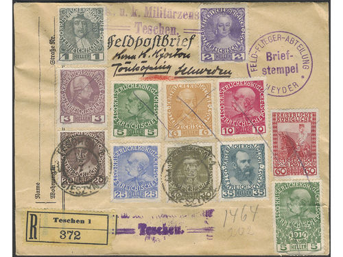 Austria. Michel 149v etc. cover, 1908 Franz Joseph 35 H laid paper and others on censored registered "Feldpostbrief" (ho.. Read more Austria. Michel 149v etc. cover, 1908 Franz Joseph 35 H laid paper and others on censored registered "Feldpostbrief" (horizontal fold) "FELD-FLIEGER-ABTEILUNG". Show less