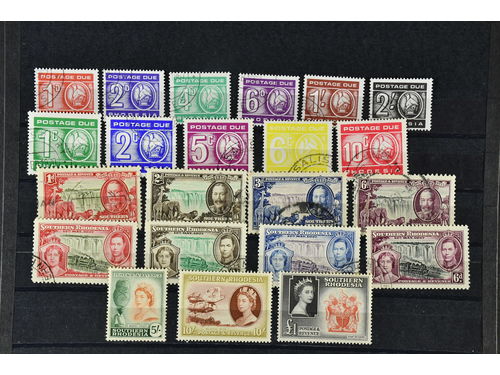 Rhodesia. Lot ★★/⊙ 1935–1953 on stock cards. Includes Silver Jubilee set (1935) Coronation set (1937) and Postage Due. Fine quality. (22)