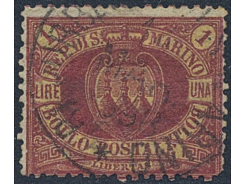 San Marino. Michel 20 used, 1892 Numeral and Coat-of-Arms 1 L carmine on yellow. Short perfs. EUR 500 San Marino. Michel 20 used, 1892 Numeral and Coat-of-Arms 1 L carmine on yellow. Short perfs. EUR 500 Show less