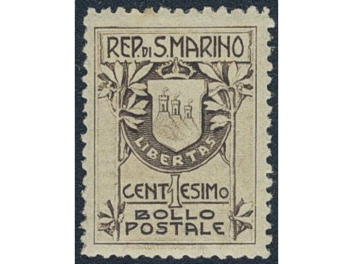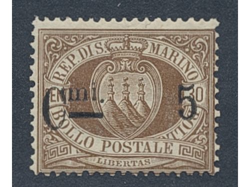 San Marino. Michel 9 ★, 1892 New value overprint 5 c on 30 c brown. EUR 350 San Marino. Michel 9 ★, 1892 New value overprint 5 c on 30 c brown. EUR 350 Show less