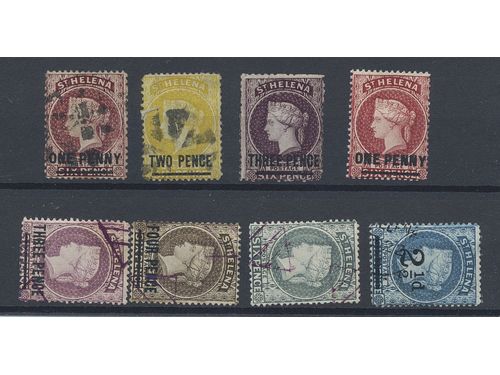 Saint Helena. Mostly used. Small lot of eight classic stamps: Sg 7,9,11,37, plus four stamps with FAKE pmks. Saint Helena. Mostly used. Small lot of eight classic stamps: Sg 7,9,11,37, plus four stamps with FAKE pmks. Show less
