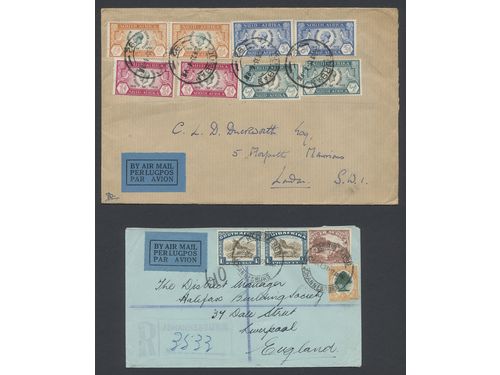 South Africa. SG 61–62 cover, Registered air mail cover sent from Johannesburg to Liverpool franked with a pair 1/- valu.. Read more South Africa. SG 61–62 cover, Registered air mail cover sent from Johannesburg to Liverpool franked with a pair 1/- value and two other stamps. Also a large cover franked with 1935 Silver Jubilee up to 6 d (pair). Show less