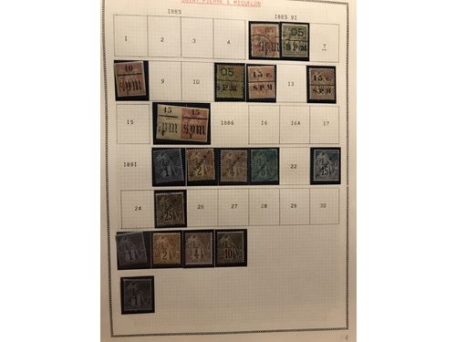 Saint Pierre and Miquelon. ★/⊙. Collection 1885–1987 incl. a very good early section and e.g. Mi73–154, 157–214, 23 over.. Read more Saint Pierre and Miquelon. ★/⊙. Collection 1885–1987 incl. a very good early section and e.g. Mi73–154, 157–214, 23 overprints Fance Libre, postage due stamps and some ** incl. Mi461–63 etc. (530) Show less