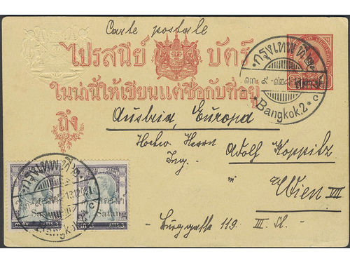 Thailand. Cover, 1 att red postal stationary card for domestic use with additional franking, sent from Bangkok to Austri.. Read more Thailand. Cover, 1 att red postal stationary card for domestic use with additional franking, sent from Bangkok to Austria in 1909. Very unusual, very fine. Show less