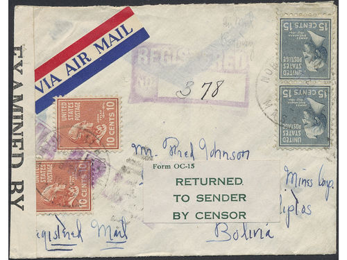 U.S.A. Michel 422, 427 cover, Registered cover sent to "Viloco de Eucaliptus" colony of exiled Americans in Bolivia. Sto.. Read more U.S.A. Michel 422, 427 cover, Registered cover sent to "Viloco de Eucaliptus" colony of exiled Americans in Bolivia. Stopped by US censor and returned to the sender. Show less
