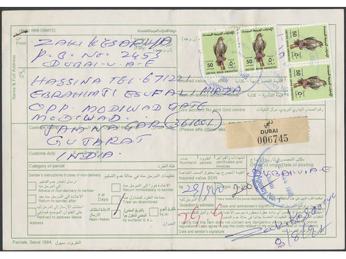 United Arab Emirates. Cover, 1990 Falcon 50d x 4 on parcel card sent registered from Dubai to India. United Arab Emirates. Cover, 1990 Falcon 50d x 4 on parcel card sent registered from Dubai to India. Show less