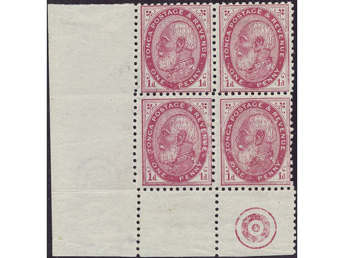 Tonga. SG 1b ★★/★, 1886 1d perf 12 x 11½ block of 4 with bottom left corner sheet margin with shifted bottom row. Three stamps **. Tonga. SG 1b ★★/★, 1886 1d perf 12 x 11½ block of 4 with bottom left corner sheet margin with shifted bottom row. Three stamps **. Show less