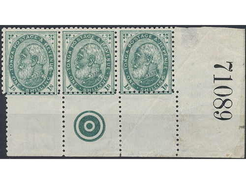 Tonga. SG 4ba ★, 1888 1a perf 12 x 11½ iwth shifted bottom row in strip of 3 with lower right sheet margin. Messy hinges, but scarce. Tonga. SG 4ba ★, 1888 1a perf 12 x 11½ iwth shifted bottom row in strip of 3 with lower right sheet margin. Messy hinges, but scarce. Show less