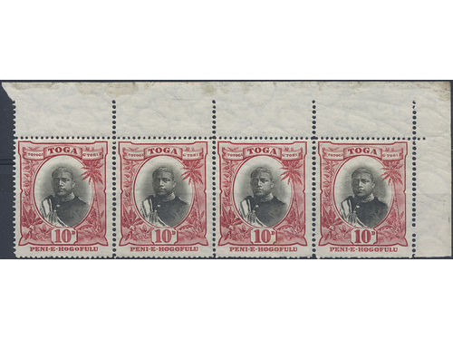 Tonga. SG 49, 49b ★, 1897 10d in strip of 4. One stamp with small "o" in "HOGOFULU" variety. GBP 230 Tonga. SG 49, 49b ★, 1897 10d in strip of 4. One stamp with small "o" in "HOGOFULU" variety. GBP 230 Show less