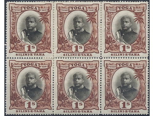 Tonga. SG 50, 50a ★★/★, 1897 1s block of 6. On stamp with missing hyphen in "E" in "TAHA" variety (pos. 1). One stamp **.. Read more Tonga. SG 50, 50a ★★/★, 1897 1s block of 6. On stamp with missing hyphen in "E" in "TAHA" variety (pos. 1). One stamp **, the others with some paper on back side. GBP 230 Show less