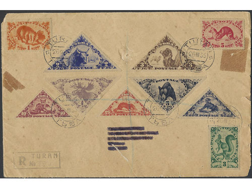 Tannu Tuva. Cover, Cover sent to Russia from TURAN 26.3.35 franked with 10 stamps. Some damages on the envelope, and the.. Read more Tannu Tuva. Cover, Cover sent to Russia from TURAN 26.3.35 franked with 10 stamps. Some damages on the envelope, and the address has been crossed out. Show less