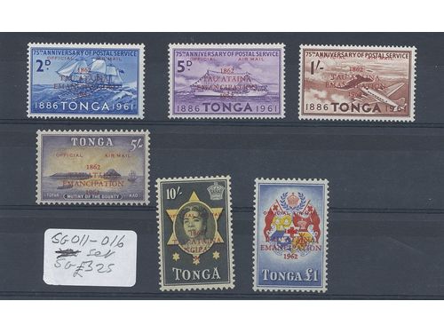 Tonga. SG O11–16 ★, 1962 Emancipation Air Mail. Tiny traces of hinges on some values. With BPA certificate. GBP 180 Tonga. SG O11–16 ★, 1962 Emancipation Air Mail. Tiny traces of hinges on some values. With BPA certificate. GBP 180 Show less