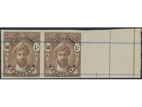 Zanzibar. (★), 1936 De La Rue plate proof of 40 c imperf. in pair on thin blue lined paper. Scarce.  140 Zanzibar. (★), 1936 De La Rue plate proof of 40 c imperf. in pair on thin blue lined paper. Scarce.  140 Show less