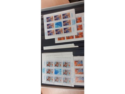 Tannu Tuva. Michel 181–87, s/s188 ★★, 1995 Horses (officially prepared but never issued stamps, numbers and values accor.. Read more Tannu Tuva. Michel 181–87, s/s188 ★★, 1995 Horses (officially prepared but never issued stamps, numbers and values according to Anders Backman's (AB) catalogue 1998). 500 imperforated and 1000 perforated cpl. sets in sheets of the seven values in the set, further about 900 perforated and 300 imperforated souvenir sheets. AB value EUR 17000. In addition about 200 perf and 200 imperf incomplete sets in sheets (missing #187). Show less