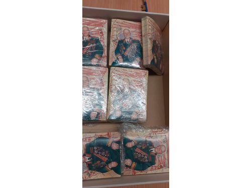 Tanzania. Accumulation ★★ 1985–1987 in removal box. Steam engines (Mi Block 44), Veteran cars (Mi Block 53), the Wedding.. Read more Tanzania. Accumulation ★★ 1985–1987 in removal box. Steam engines (Mi Block 44), Veteran cars (Mi Block 53), the Wedding of Prince Andrew and Sarah Ferguson (Mi Block F–G 62) and a few other issues in a large number of perforated and imperforate s/s or uncut sheets. Party curled up, but can be splitted into a substantial quantity of sets. Approx. 17 kg. (1000s) Show less