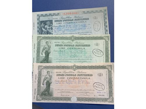 Miscellaneous, Italy. "BVONO POSTALE FRVTTIFERO" á 50 000, 100 000 and 500 000 lire. Show less