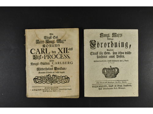 Proclamations, Sweden. Ten different Royal Proclamations 1719–1826, e.g. "Carl den XII:tes Lijk-Process" (1719) and regarding "Straff för them, som öfwa wåldsamheter emot posten" (1755) and a decree for the fire brigade "Instruction för Strål-Förarne vid Stadens Sprutor" (Stockholm, 1822). Fine to Very fine condition. The entire lot is presented at www.philea.se. (11). Show less
