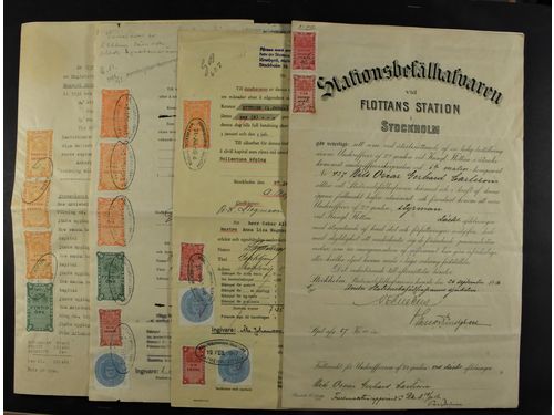 Sweden. Revenues, lot. A various range of documentary revenue stamps on 32 documents, added with Stockholm and Gothenbur.. Read more Sweden. Revenues, lot. A various range of documentary revenue stamps on 32 documents, added with Stockholm and Gothenburg municipal revenues on some. (32) Show less