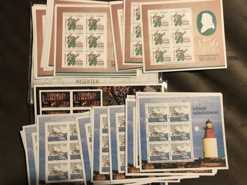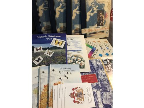 Sweden. Face value. Lot with gift books, year set 1993 and some Subject sheets etc. Face value > 3400. Approx. 5 kg. Show less