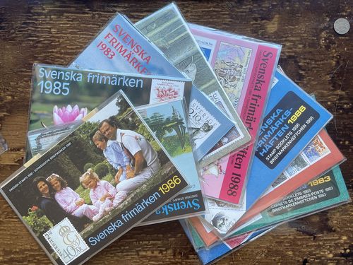 Sweden. Face value, lot 1982–1988 in box. Year sets: 1977, 79–83, 85–87 (face value 900 + 32 discount stamps). Booklet year sets: 1981–83, 85, 86, 88 (face value 820 + six discount stamp booklets). Face value in total 1750 + discount stamps. Show less
