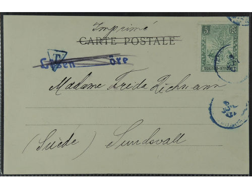 Sweden. Facit 62. Incoming stamped mail. Madagascar. 1903 Traveler's Tree and Lemur 5 c yellow-green on postcard sent as.. Read more Sweden. Facit 62. Incoming stamped mail. Madagascar. 1903 Traveler's Tree and Lemur 5 c yellow-green on postcard sent as printed matter 5.JUIL.05 to Sundsvall. Show less